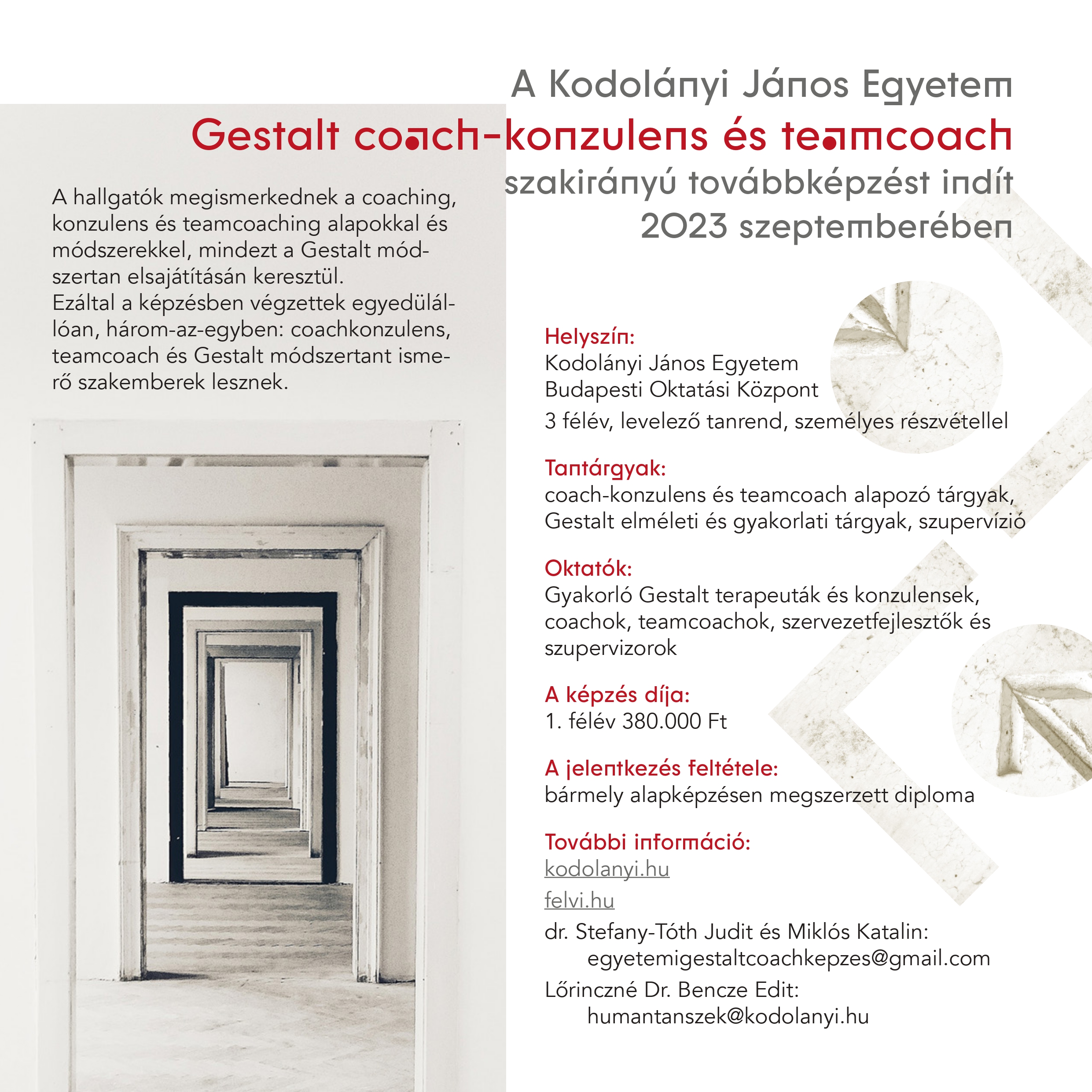 A Kodolányi János Egyetemen 2023. szeptemberében indul a Gestalt coach-konzulens és teamcoach szakirányú továbbképzés első évfolyama.